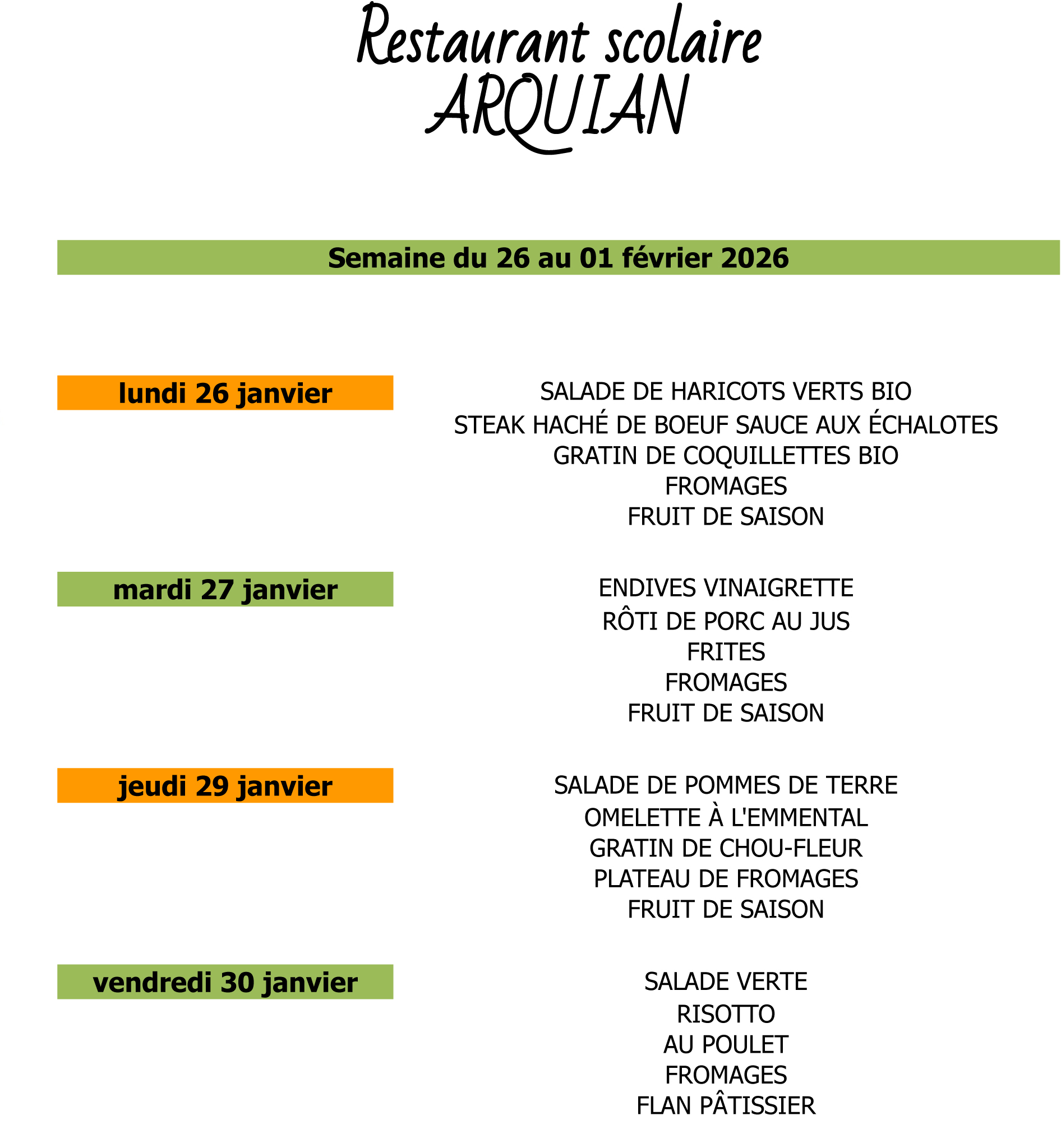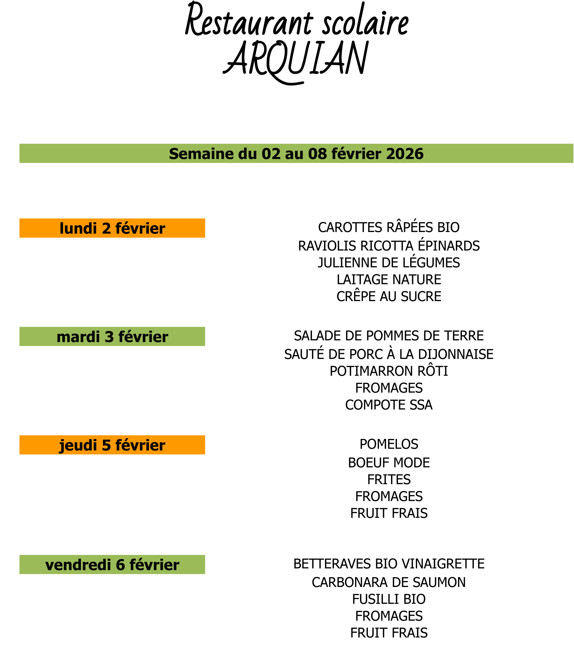 Fonctionnement et tarifsUn service de restauration scolaire est géré et organisé par la commune d'Arquian. Les repas sont fournis par la cuisine de la Maison de retraite les Ocrières de Saint-Amand-en-Puisaye. Le fonctionnement du restaurant scolaire est assuré par du personnel communal. L'animation de ce temps périscolaire est confiée au centre social et culturel de St-Amand-en-Puisaye. Les inscriptions au service de restauration scolaire se font directement auprès des enseignantes. Un ticket d'inscription est mis dans le sac des enfants une semaine à l'avance et doit être retourné avant le mardi. Les tarifs pour l'année scolaire 2025/2026 sont les suivants :